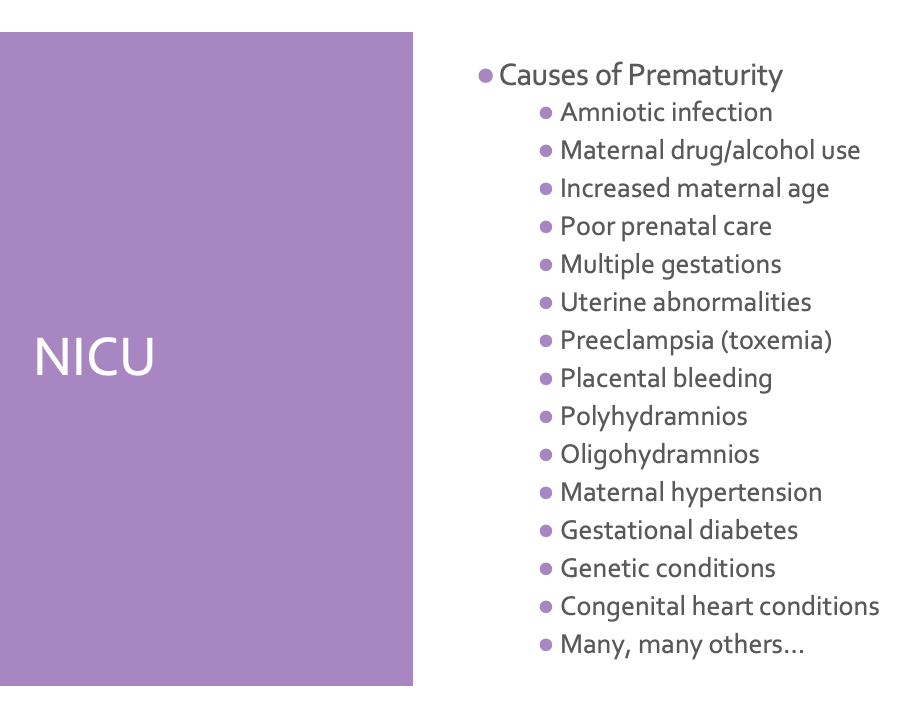 Amniotic infection, maternal drug/alcohol use, increased maternal age, poor prenatal care, multiple gestations, preeclampsia, and genetic conditions.