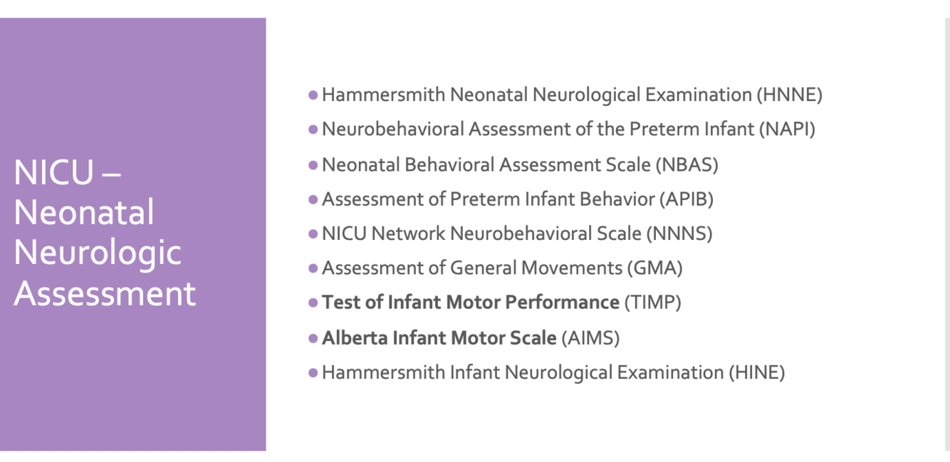 What are the Hammersmith and TIMP assessments used for in the NICU?