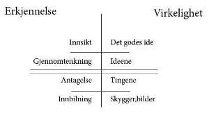 Øverst har vi det Godes ide, under denne er ideene, som er etterligninger av det Godes idè. Tredje nivået er tingene og nederst er skygger, refleksjoner og bilder.