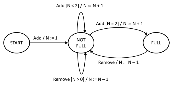 Let us refer to the transitions with E1, …, E5 as in the picture. The variable N denotes the number of elements currently stored. Each “Add” event increases it by 1, and each “Remove” event decreases it by 1. Notice, that when the “Add” event occurs while being in the NOT FULL state, the state changes to FULL only if N=2. If N<2, the system stays in the NOT FULL state. If N=0, no “Remove” action is possible. Similarly, if N=3, no “Add” action is possible.