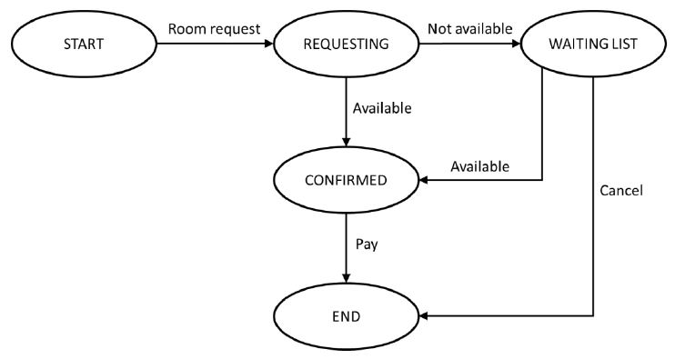 TC2: START (Room request) REQUESTING (Not available) WAITING LIST (Available) CONFIRMED (Pay) END
