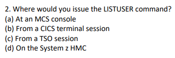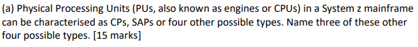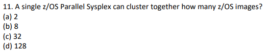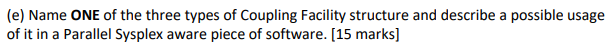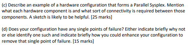 (c) Answer: marks for: z/OS LPARs or separate CECs (must be at least two), a coupling facility, a sysplex timer and ETR channels from CECs to sysplex timer (or mention of STP and an ETS connected to HMC), CF channels between each z/OS system and the CF, DASD along with FICON/ESCON channels from each z/OS system