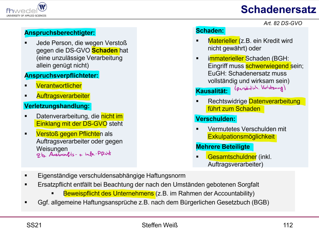 (Artikel, Anspruchsberechtigter, Anspruchsverpflichteter, Verletzungshandlungen, Schadensarten, Kausalität, Verschulden)