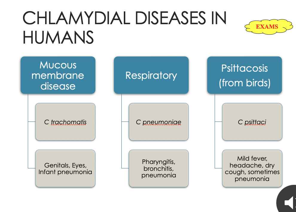 3) C psittaci → psittacossis (birds) Mild fever, headache, dry cough, sometimes pneumonia)