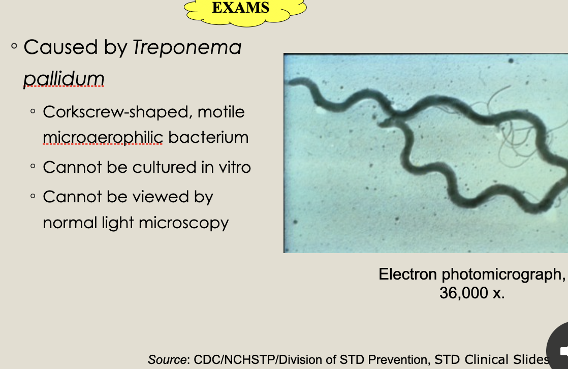 Treponema pallidum, corkscrew, motile, need darkfield/ fluoresc to see