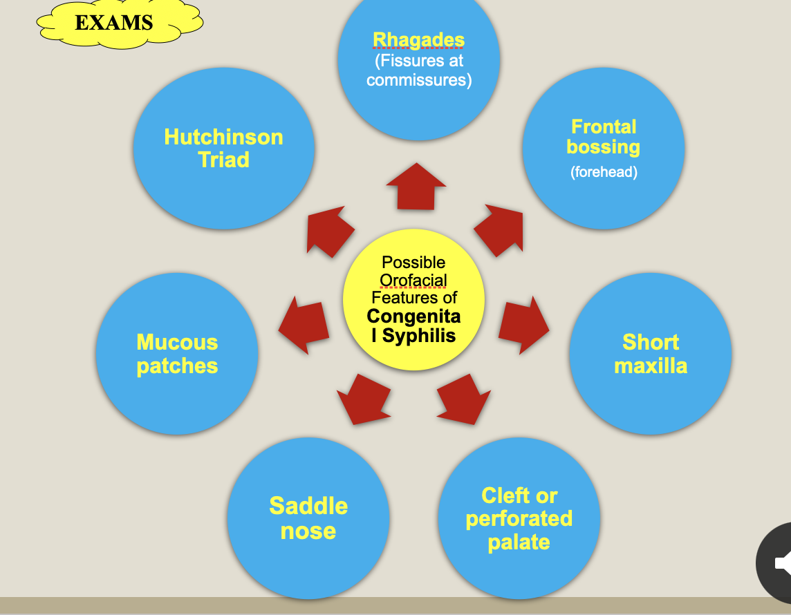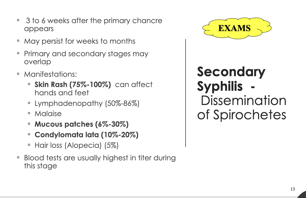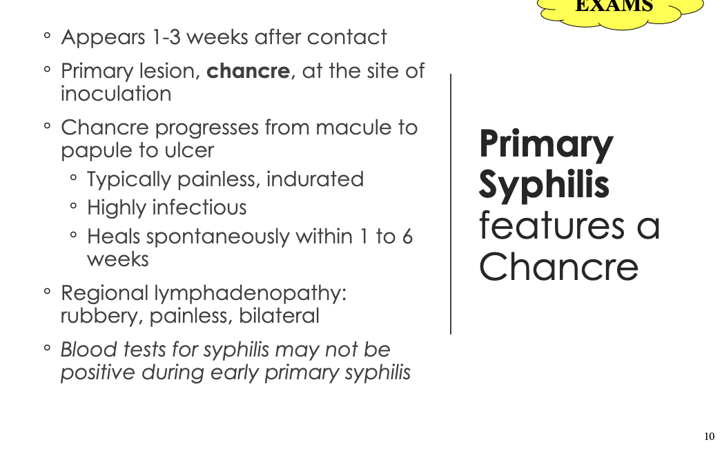 1) Chancre (macule→papule→ulcer) on the site of inoculation