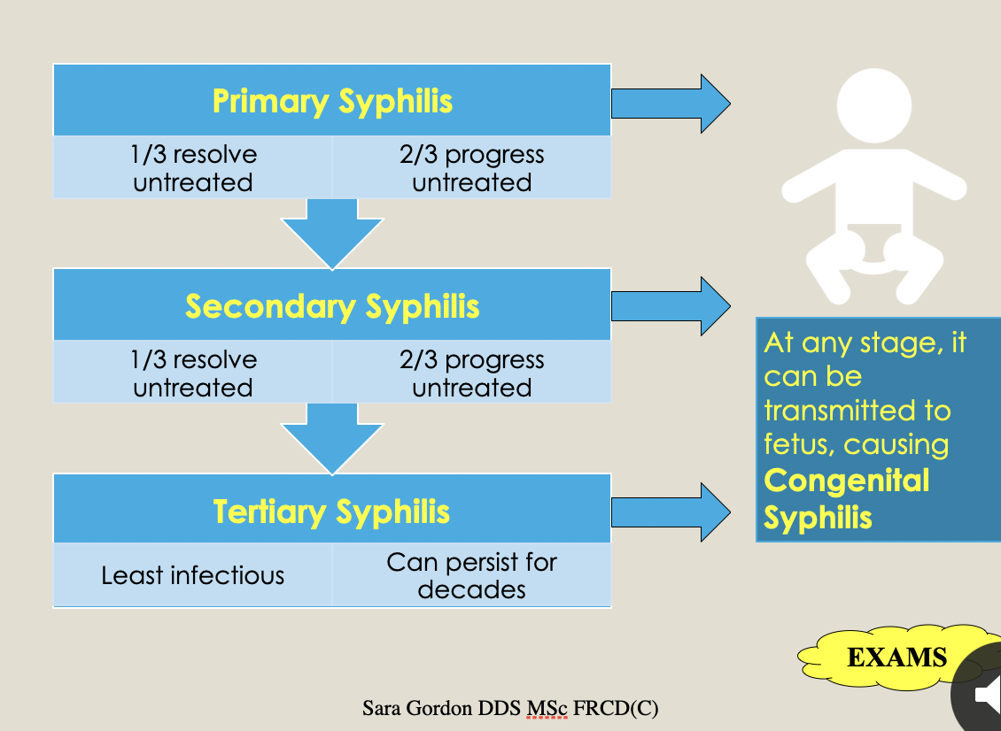 What are the three stages of syphilis? What is the likelihood of progression? When is it transmittable?