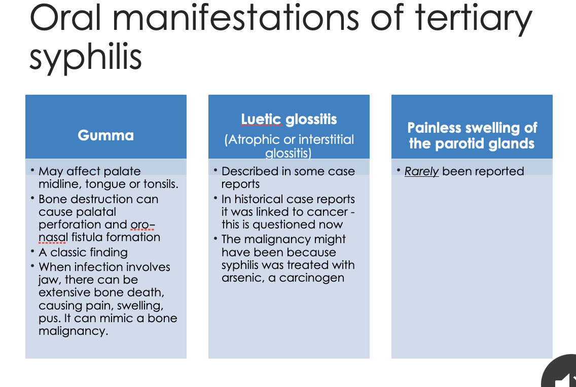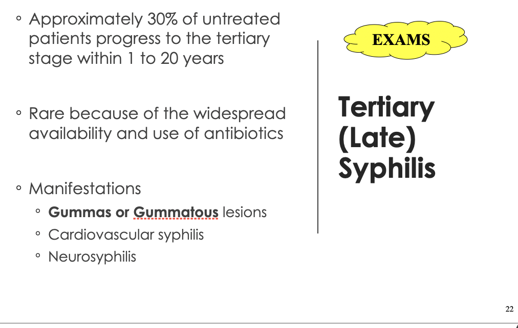 What are the clinical signs of tertiary syphilis? Likelihood of progression?