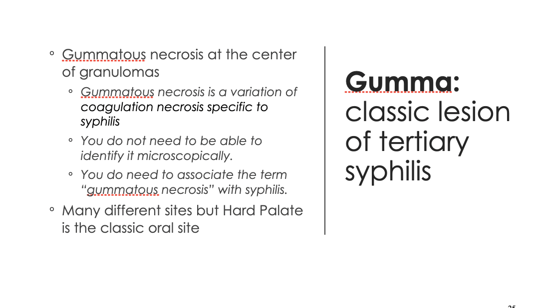 Gummatous necrosis at the center of granulomas -variation of coagulation necrosis