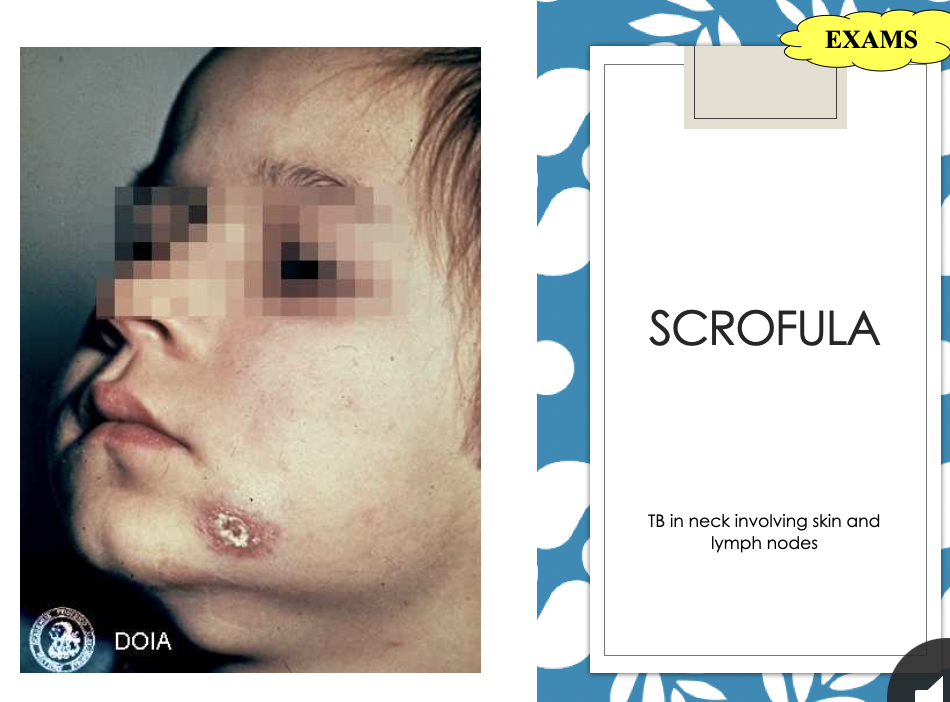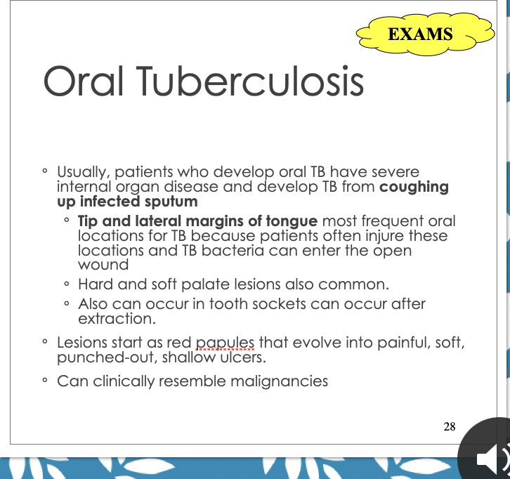 Someone with an active lung TB →infected sputum→cut open wound in mouth(tongue or tooth extracted socket)
