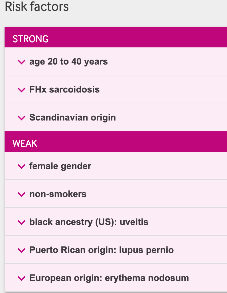 What are the risk factors for sarcoidosis?