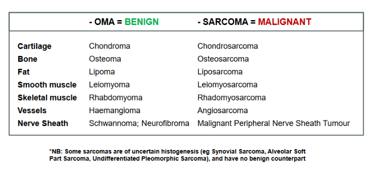 - Typically in children/teens/young adults: Ewing sarcoma, Osteosarcoma, Rhabdomyosarcoma, Synovial Sarcoma.