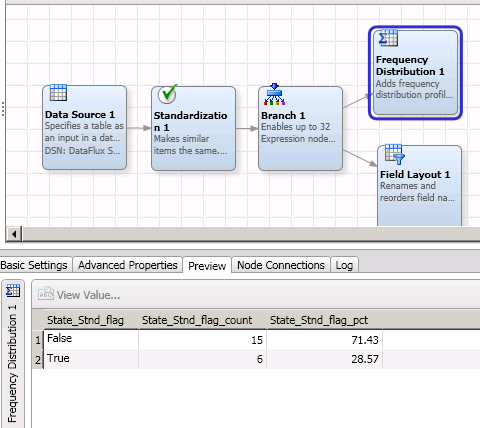 A Frequency Distribution node can assist in determining how well standardization rules and QKB customizations are addressing data quality issues. By selecting the frequency count of the standardization flag field, what do the Preview window results represent?