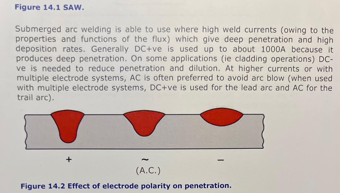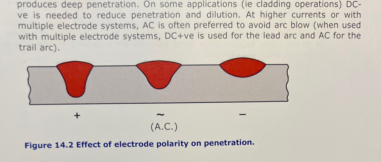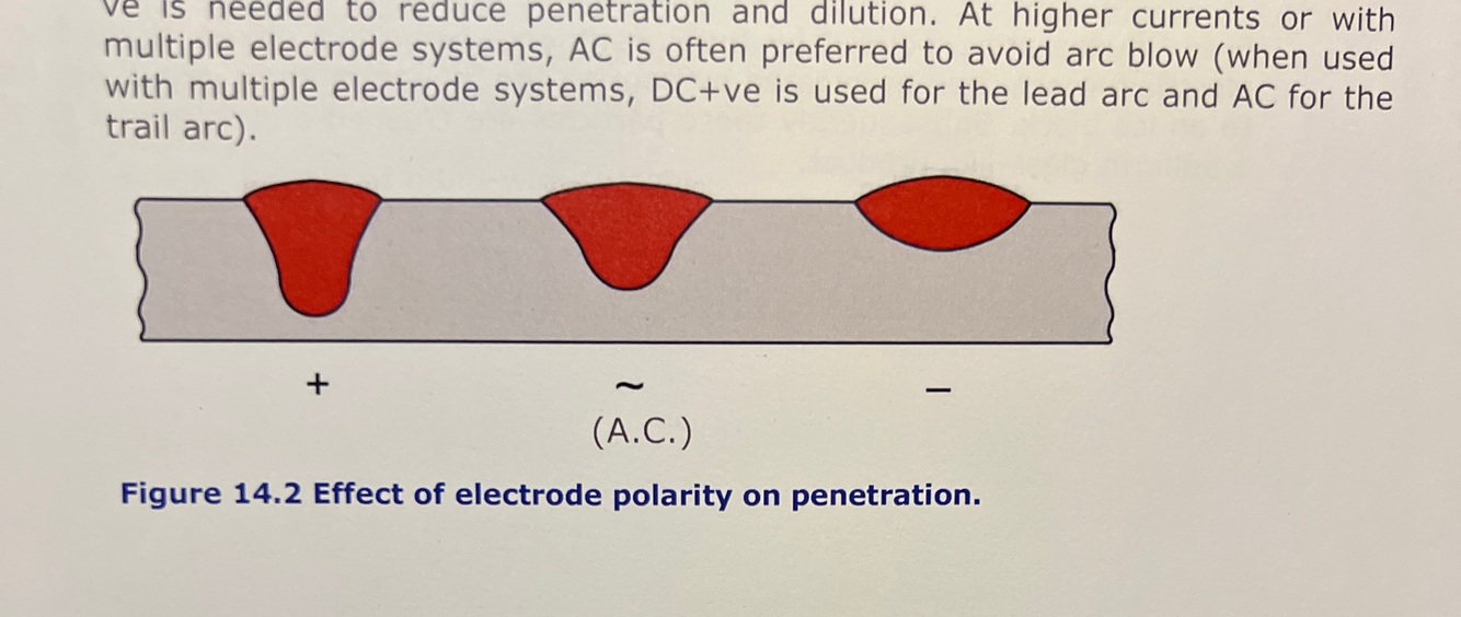 In multiple electrode systems (in saw) which polarity is often the lead arc? Which polarity is the trailing arc? And why?
