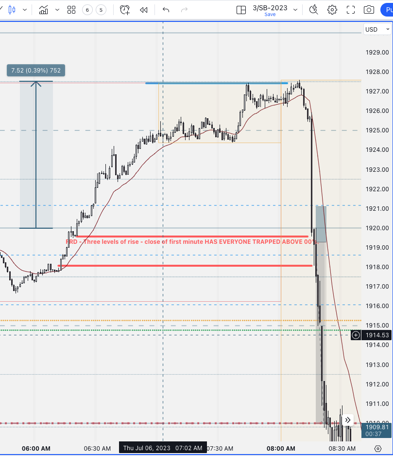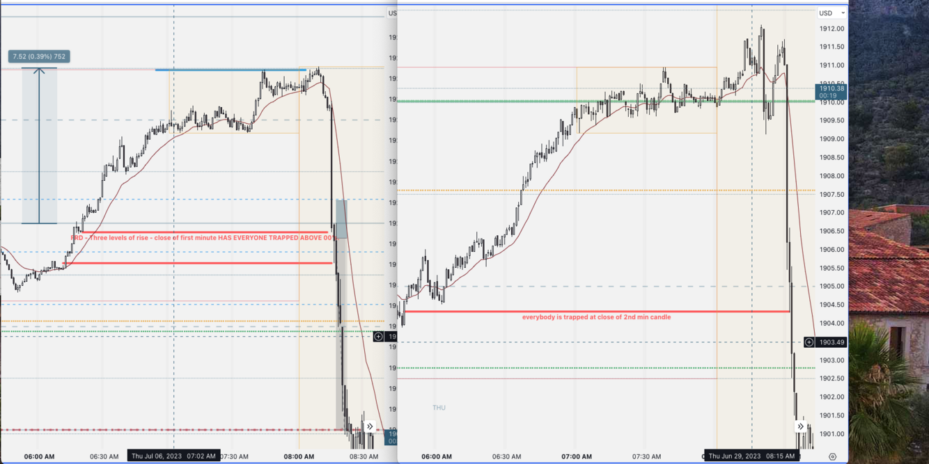 Two examples on gold, june 29 and juli 6, 2023. Price drops 1 tp 2 minutes and wipes out the entire volume to the left. This is on news, MRN.
