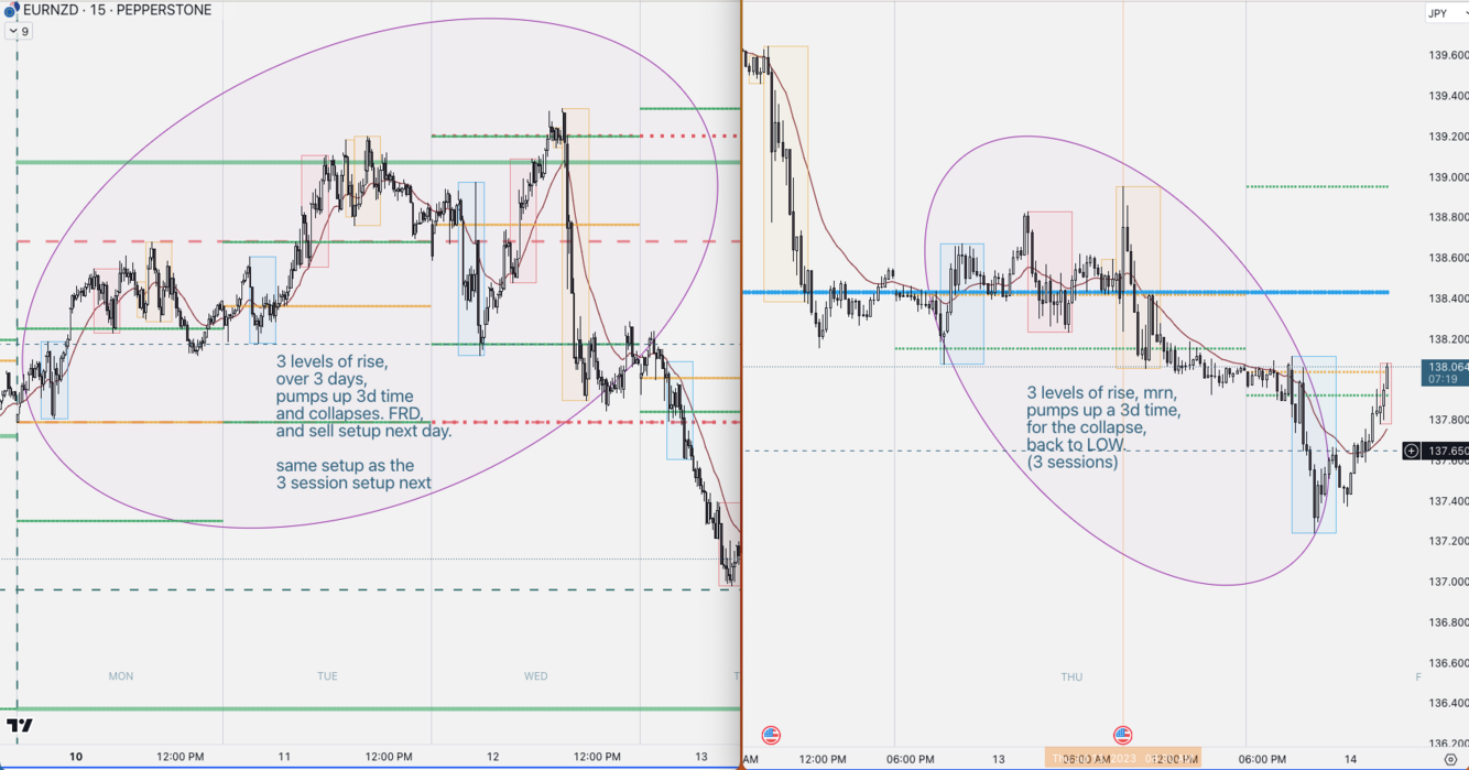First bar, especially on a d2, 3 levels of rise; first bar traps the entire 1/3 to 1/2 of the 3 levels of rise on a D2 and target is LOD or LOW. No wicks on either side.