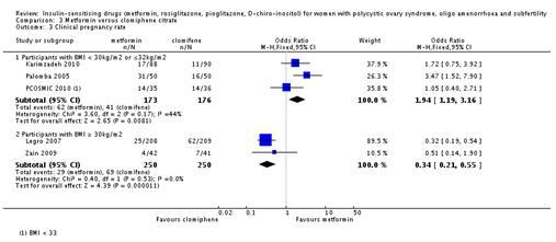 The following figure refers to the first question on this page: Reproduced with permission from Tang T et al. Cochrane Database Syst Rev 2012;(5):CD003053 This analysis above is taken from a meta-analysis of ovulation rates in women with polycystic ovarian syndrome (PCOS) taking metformin compared with clomifene ovulation induction therapy. Subgroup analysis was also carried out using a cut-off BMI level of 30 kg/m2.
