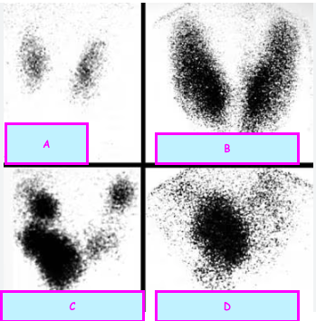 A: normalB: Graves DiseaseC: TMGD: Toxic adenoma