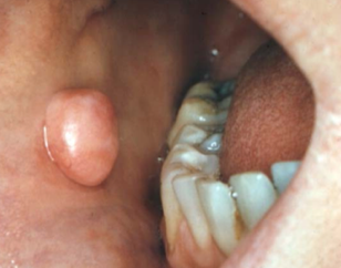 Speckled mucosa found at the angle of the mouth.