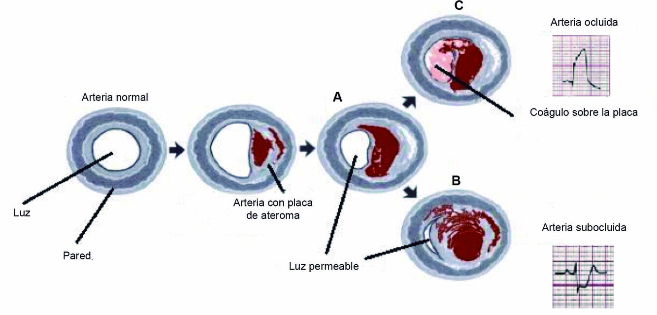 * Obstruccion de perfusion del miocardio por rotura o erosion de placas de ateroma.