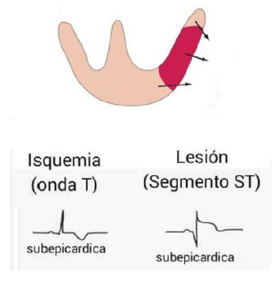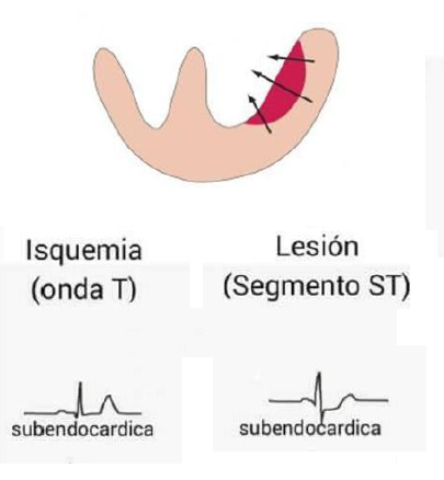 2. Seguido de elevación del ST (me indica que el subepicardio está sufriendo LESION debido al tiempo demorado de isquemia)
