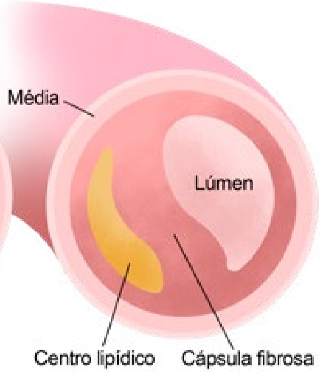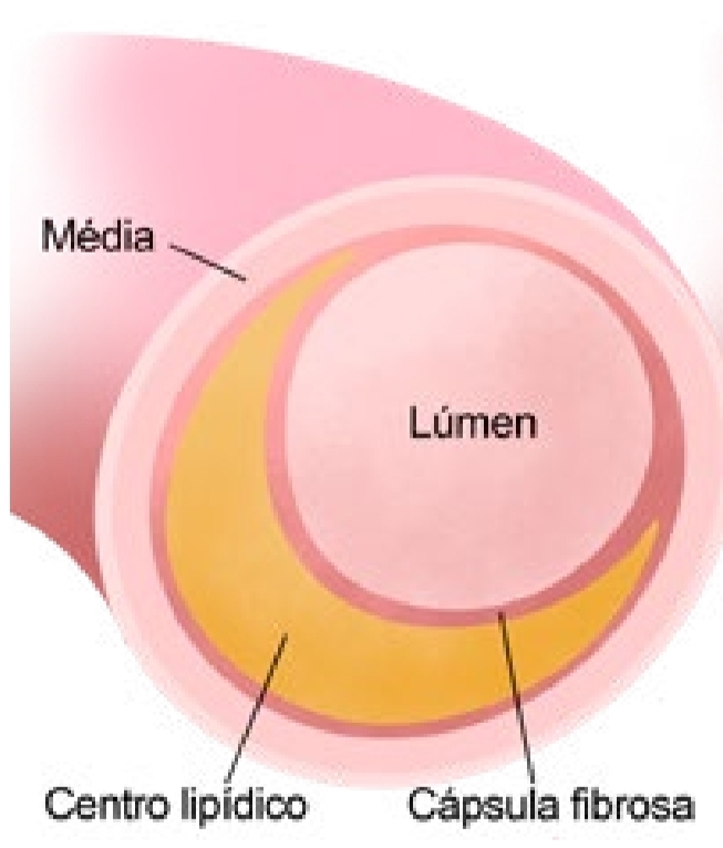 Por fim, forma-se a capa fibrótica, que delimita o ateroma. O ateroma consiste em uma estrutura de core lipídico recoberta por capa fibrosa na região subendotelial da coronária.