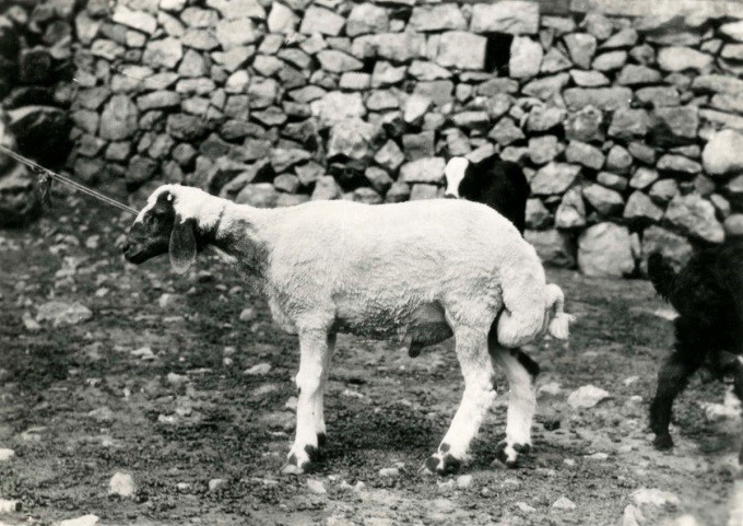 zeer fijn nogal lang gekrulde witte wol (ook op voorhoofd), rammen zijdelings vd kop opgerolde hoornen, ooien hoornloos