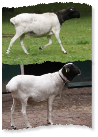 blauwgrijze onbewolde ledematen/lange kop met breed voorhoofd, mondslijmhuid zowat zowat zwart, witte wol, hoornloos