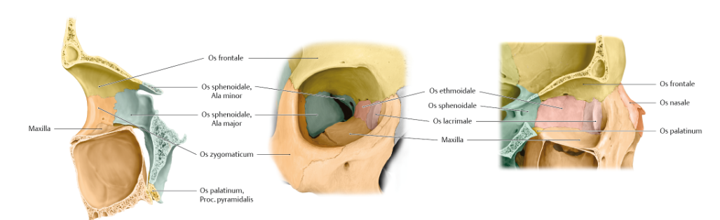 - Paries medialis (von vorne nach hinten): Proc. frontalis maxillae, Os lacrimale (Fossa sacci lacrimalis), Lamina orbitalis ossis ethmoidalis, Corpus ossis sphenoidalis<br></br>- Paries superior (Dach): Pars orbitalis ossis frontalis, Ala minor ossis sphenoidalis<br></br>- Paries lateralis: Os zygomaticus, Processus zygomaticus ossis frontalis, Ala major ossis sphenoidalis<br></br>- Paries inferior (Boden): Maxilla, Os zygomaticus, Processus orbitalis ossis palatine