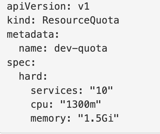 oc create quota dev-quota –hard services=10,cpu=1300m,memory=1.5Gi
