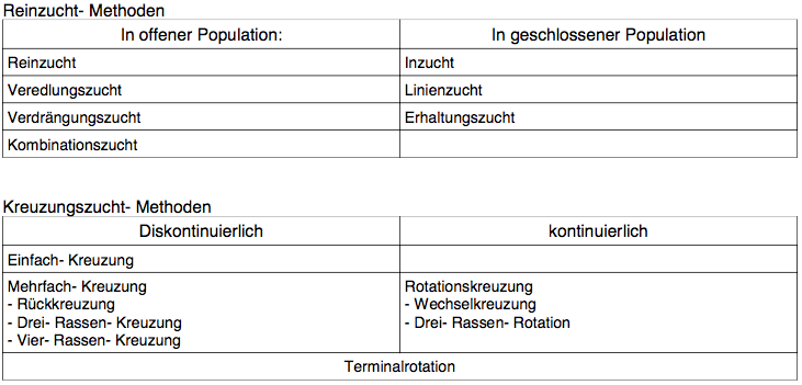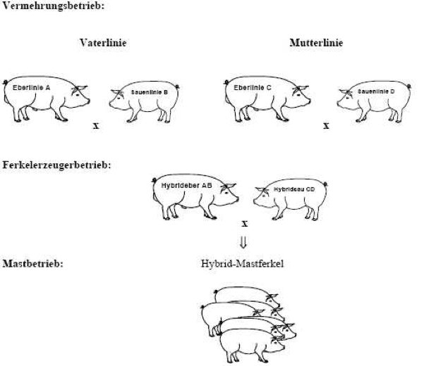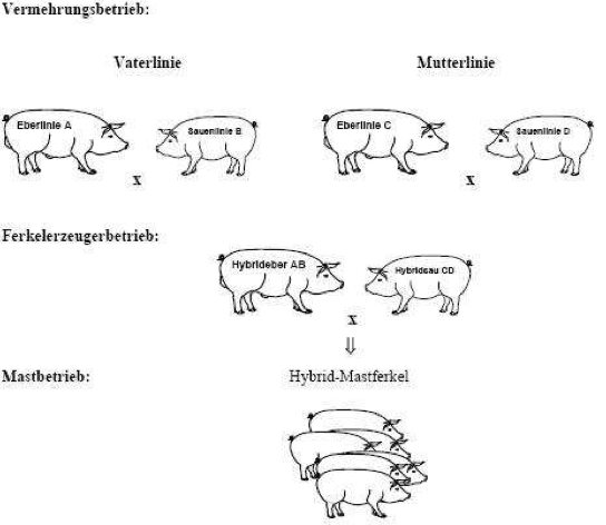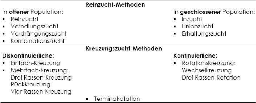 diskontinuierliche Kreuzung: Erzeugung von Kreuzungstieren, die gute Merkmale aus den Elterntieren erhalten und die nur als Nutztiere geahlten werden (Schwein) → Heterosis Effekt