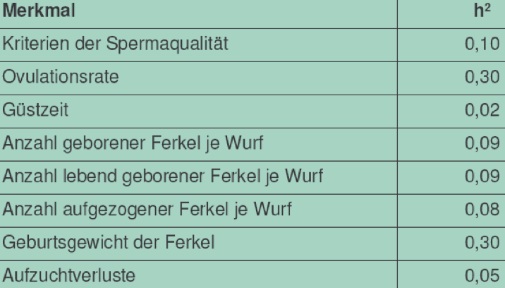 Wie hoch ist die Heritabilität der merkmale Spermaqualität, Ovulationsrate, Anzahl geborener Ferkel je Wurf, Anzahl aufgezogener Ferkel je Wurf, Geburtsgewicht der Ferkel und Aufzuchtverluste?