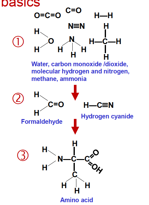 Explain the rudiments of prebiotic chemistry on earth, i.e. how simple molecules (carbon monoxide, carbon dioxide, molecular hydrogen and nitrogen, methane, ammonia) were processed by liquid water to eventually form amino acids