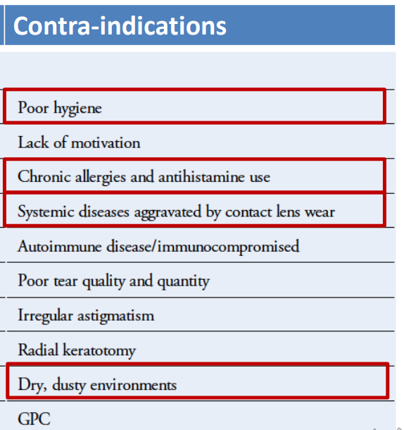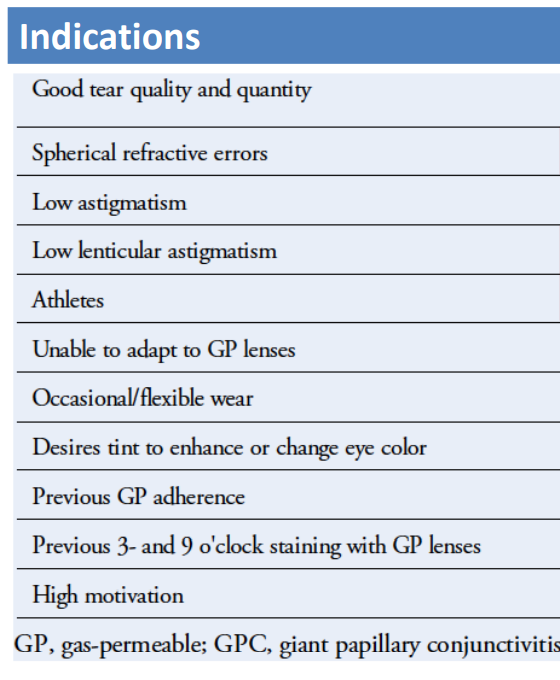 [Stiffer lenses though may have adverse effects as they cause an edge lift and can cause a SEAL, they can cause mucin balls or CLPC (Contact Lens Papillary Conjunctivitis)]