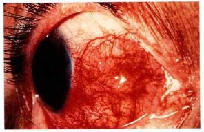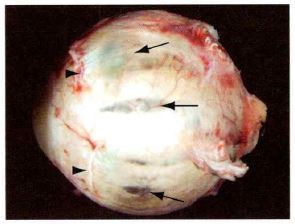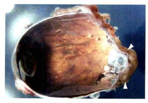 Calcific plaques and deposits in the sclera anterior to the rectus muscle insertion.