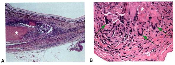 Necrotizing granulomatous scleritis and palisading arrangement of histiocytes and multinucleated giant cells.
