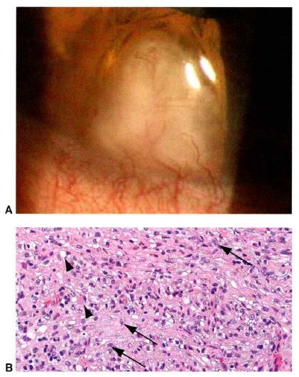 Fibrous histiocytoma of the corneoscleral limbus and spindle-shaped fibroblasts, epithelioid and lipid-laden histiocytes, and scattered lymphocytes.