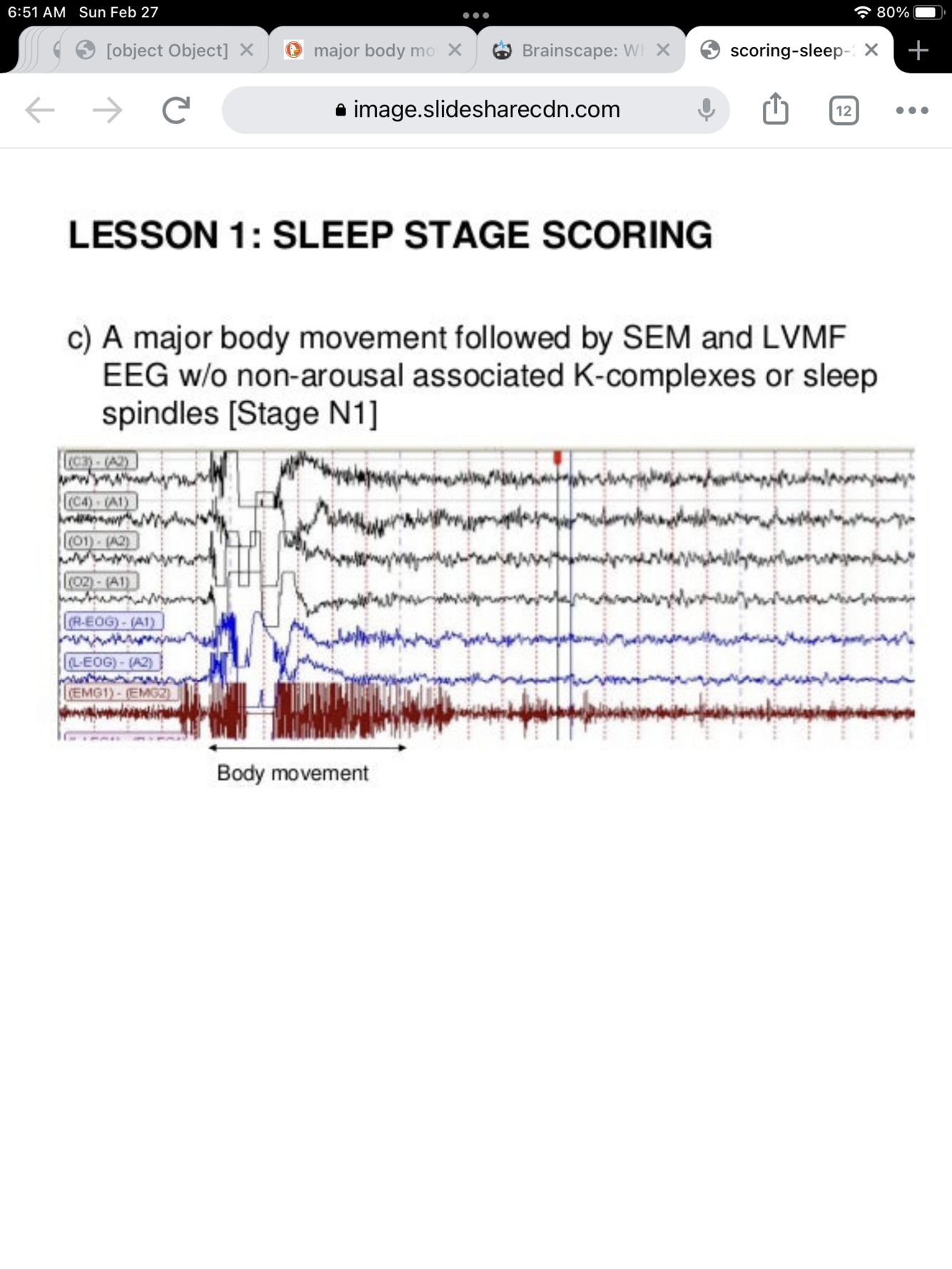 Major Body Movement: Scoring sleep stage if the movement and muscle artifact obscures more than 1/2 the epoch to the extent that stage cannot be determined