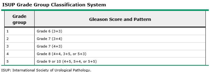 The new grading (grade group) system — The 2014 International Society of Urological Pathology (ISUP) consensus conference adopted a new grading system based upon the modified Gleason scores. This new grading (grade group) system has been adopted in the 2016 World Health Organization (WHO) classification of genitourinary tumors.