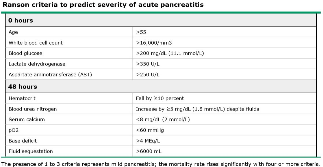 A score based upon Ranson’s criteria is one of the earliest scoring systems for severity in acute pancreatitis. Ranson’s criteria consist of 11 parameters. Five of the factors are assessed at admission and six are assessed during the next 48 hours. A later modification for biliary pancreatitis included only 10 points. Mortality increases with an increasing score. Using the 11 component score, mortality was 0% to 3% when the score was <3, 11% to 15% when the score was ≥3, and 40% when the score was ≥6. Although the system continues to be used, a meta-analysis of 110 studies found the Ranson score to be a poor predictor of severity.