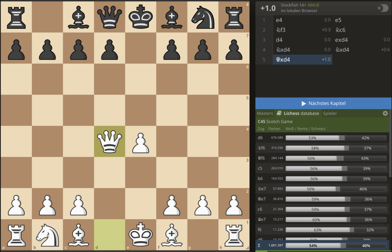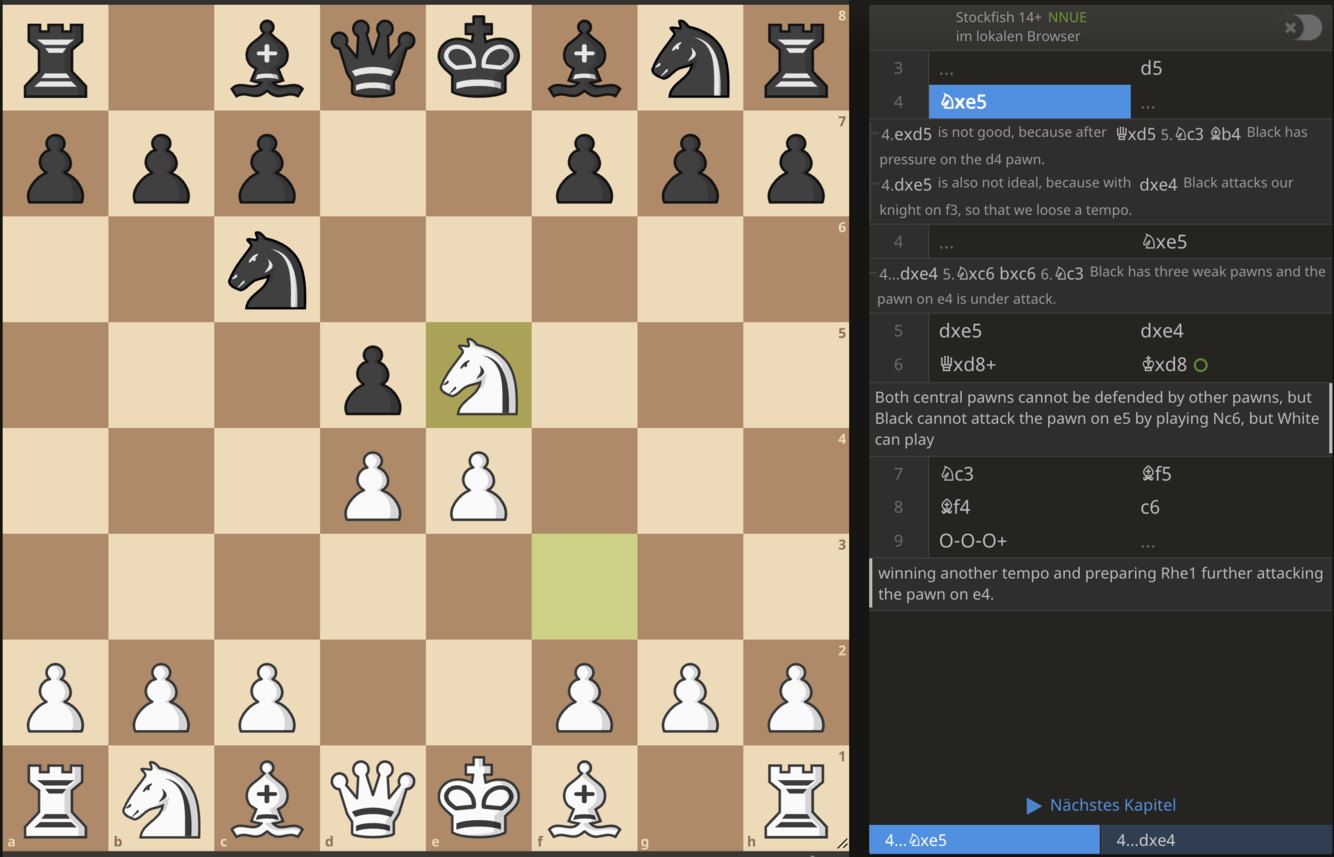 We play Nxe5 and go for a queen exchange and better endgame after …Nxe5, dxe5 dxe4, Qxd8, Kxd8, Nc3.