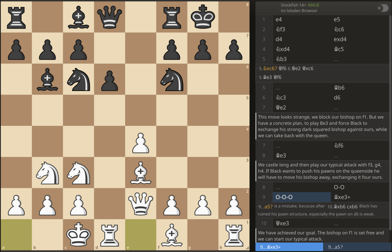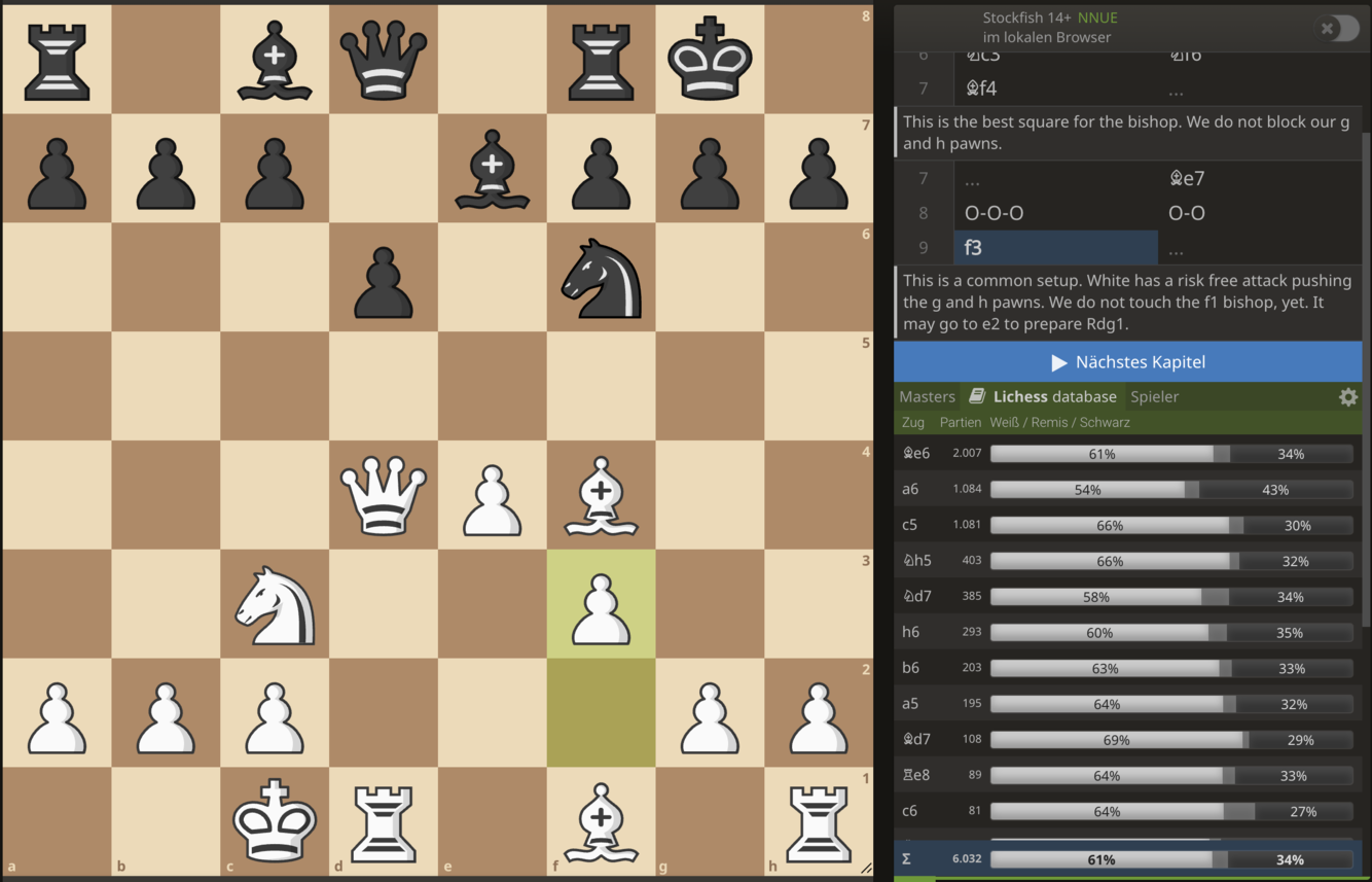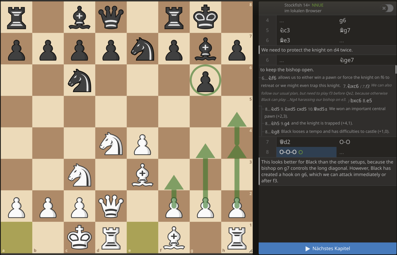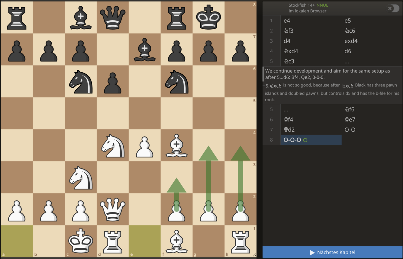 We go for our usual setup: Nc3, Bf4, Qe2, O-O-O, f3 and attack the kingside with g4, h4. We do not play Nxc6.