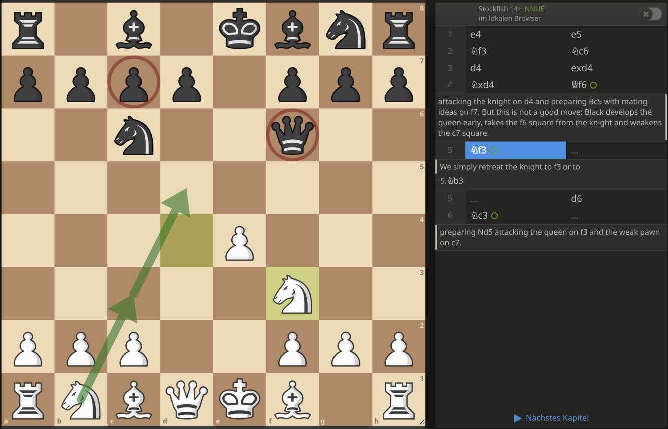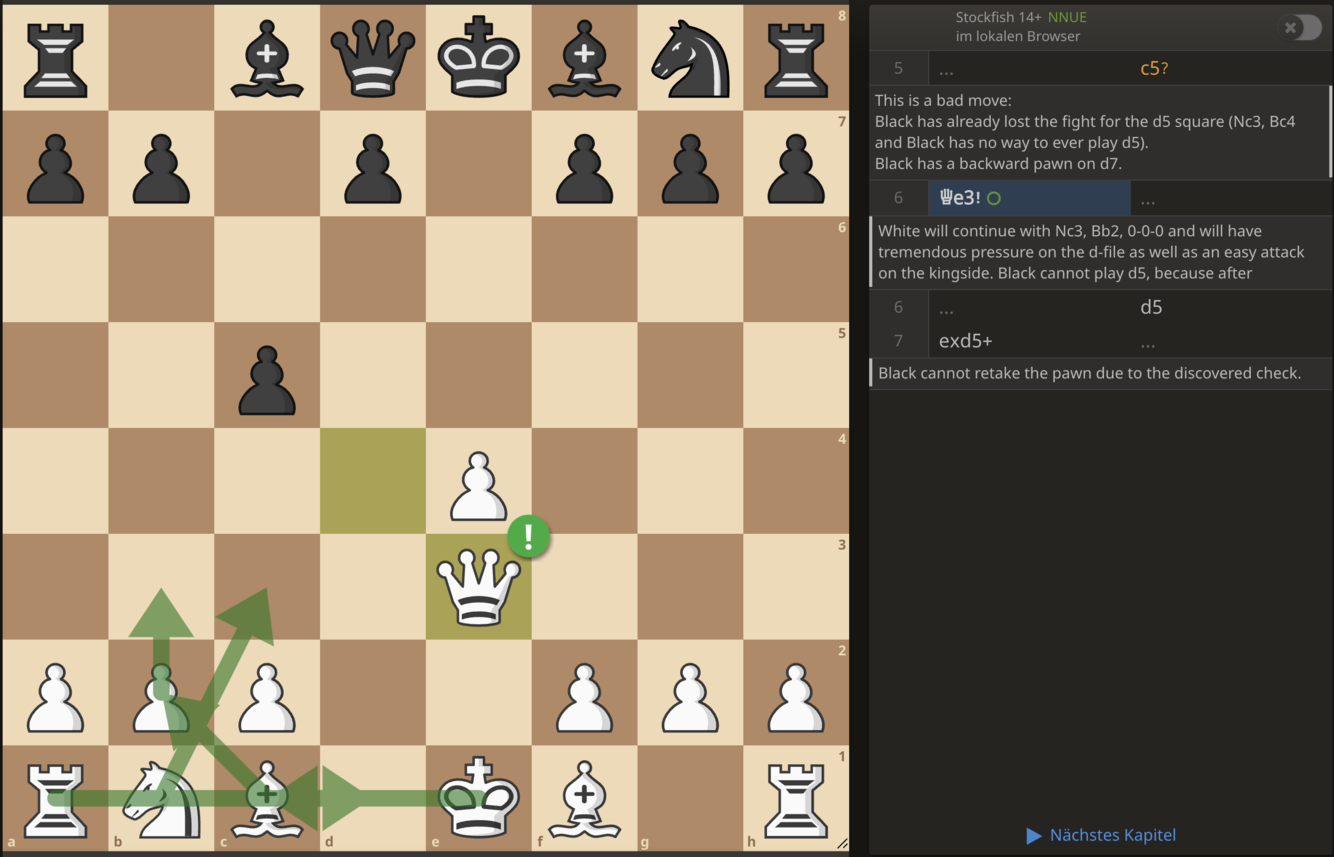 We retreat the knight to f3, preventing Bc5, with an X-Ray on our weak f2 square. We then exploit the misplaced queen position by attacking it and the weak c7 square via Nc3, Nd5.