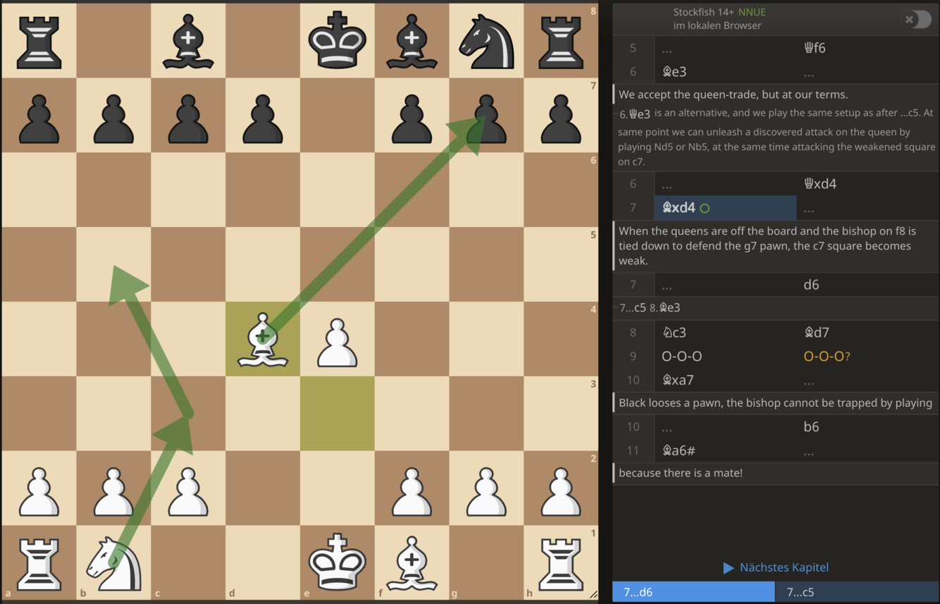 We play Be3 to exchange queens on our terms. Our bishop on d4 is strong on the long a1-h8 diagonal and we go for the c7 weak point with Nc3, Nb5.