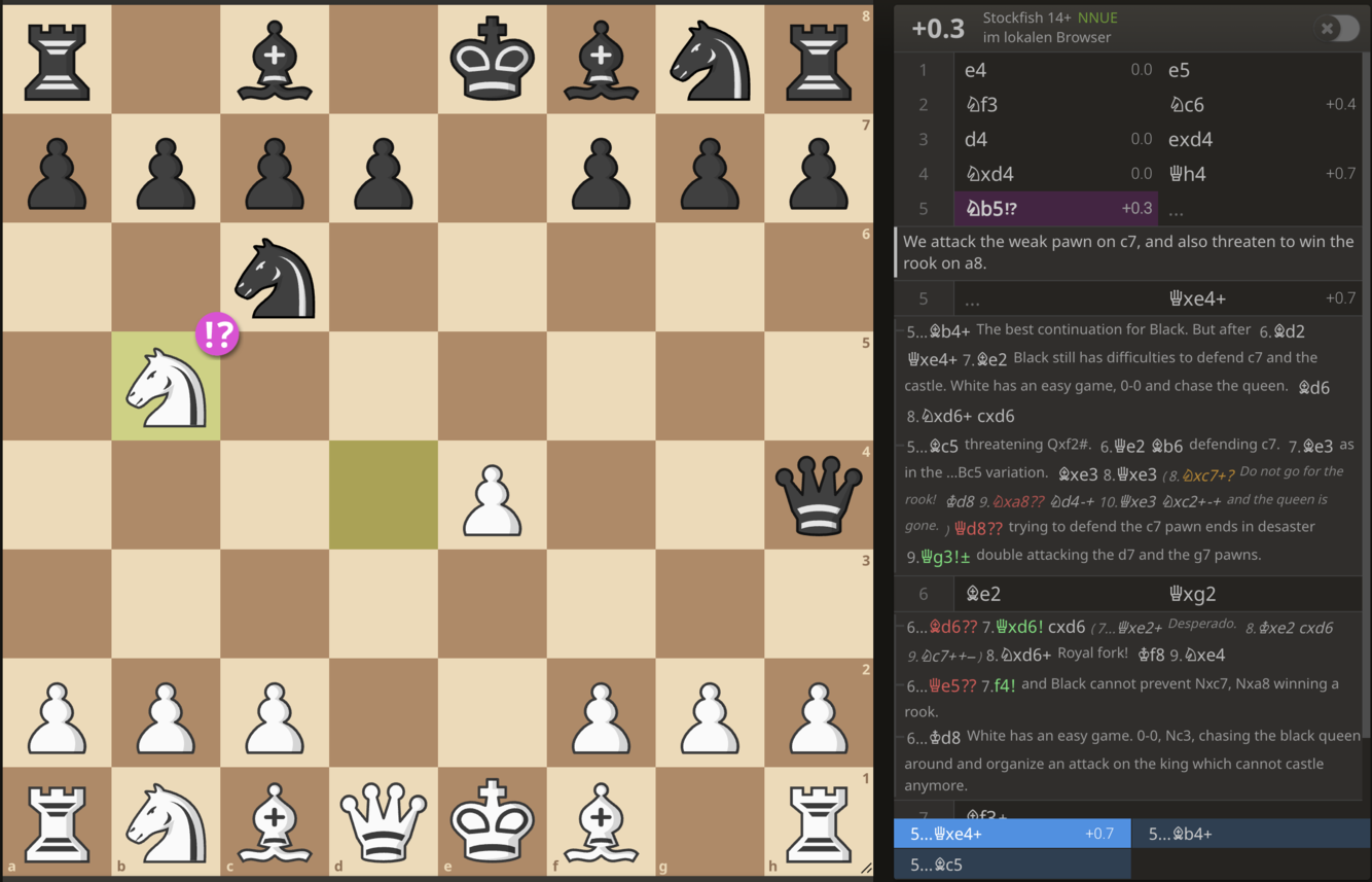 We counterattack by playing Nb5 going for the c7 weak point. We always look for a c7 attack when the queen moves early.