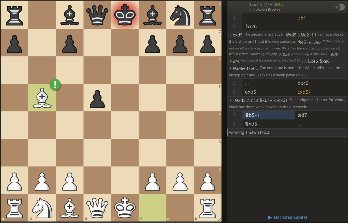 This time we take Nxc6, bxc6, exd5, cxd5, and now comes Bb5+! winning at least a pawn.
