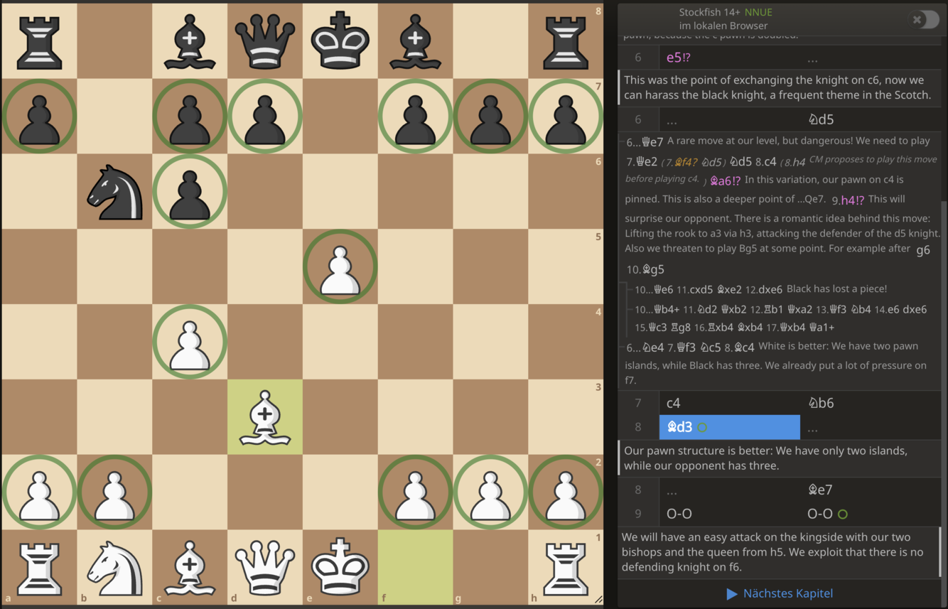 We take Nxc6, bxc6, and then go for e5 harassing the knight, after …Nd5 we play c4, followed by …Nb6, Bd3 immobilizing the knight and targeting the kingside with our bishops and queen.