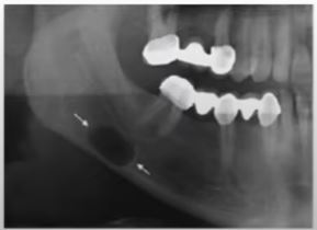 * A radiolucency in posterior mandible below IAC