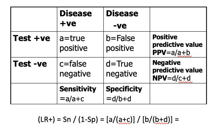What is prevalence, sensitivity,specifcity, positive/negativ epredictive value and likelihood ratio