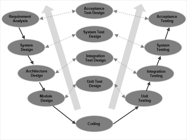 The V-Model is an extension of the waterfall model and is based on the association of a testing phase for each corresponding development stage. This means that for every single phase in the development cycle, there is a directly associated testing phase. This is a highly-disciplined model and the next phase starts only after completion of the previous phase.